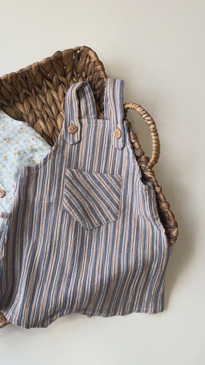 Peto de bebé estampado de rayas en tonos azul, ocre y crudo, un diseño atemporal y versátil para el verano. Su patrón de rayas suaves aporta un estilo fresco y fácil de combinar para bebés.