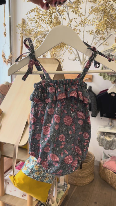 Ranita de tonos rosados y azulados con tirantes de lazo ajustables y un delicado volante en el pecho que le aporta un aire dulce y especial.